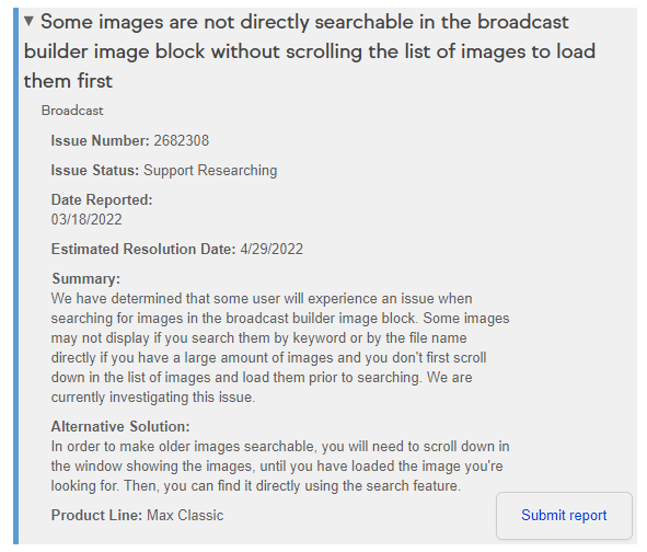 When adding a new image to an email in Broadcast builder I have always been able to use the search bar to find old uploaded images that I want to include in my emails, however, since Monday 14th March I have found that when I search for an image name I only receive results for images which are currently “loaded” in the side-bar, meaning that when I want to add an image which was uploaded a while ago I am forced to scroll down the list of images and wait for the list to expand, right back to the date/time that the image was originally uploaded.